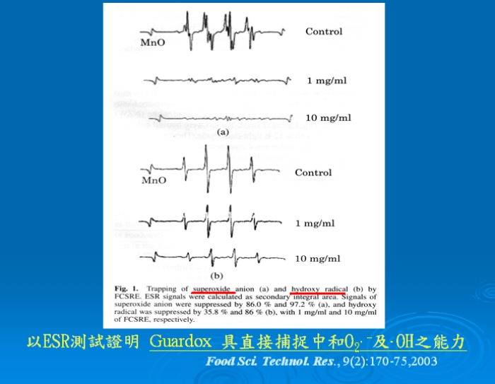 <2>以ESR偵測,證實 raffinee 具直接捕捉中和 O2-及OH之能力。