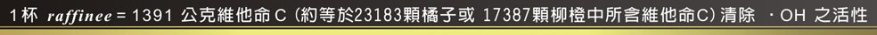 1杯 raffinee = 1391公克維他命C (約等於23183顆橘子 或 17387顆柳橙中所含維他命C) 清除 •OH 之活性