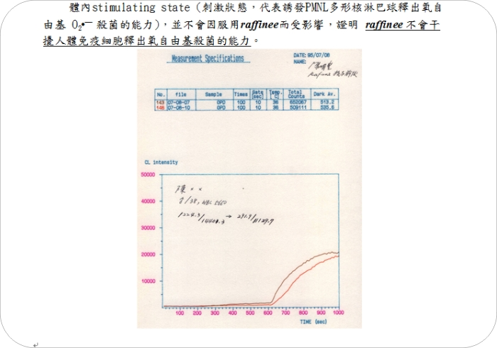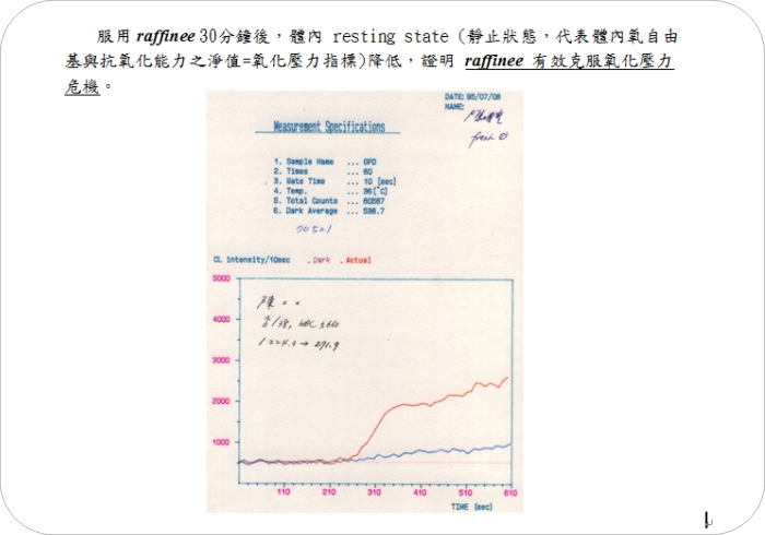 運用化學微量發光分析儀(chemiluminescence),研究證實,raffinee 確實是可以維持體內抗氧化優勢的優秀產品,可以長期食用,值得信賴,安全無副作用。 (如下所示)