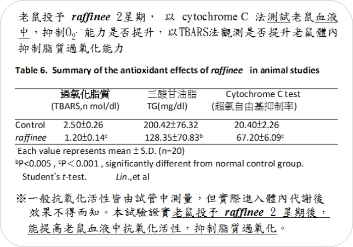 在動物實驗中,餵食老鼠服用raffinee 二星期,便可提高老鼠體內抗氧化能力,降低血液中過氧化脂質,證實 raffinee 口服之抗氧化效果。