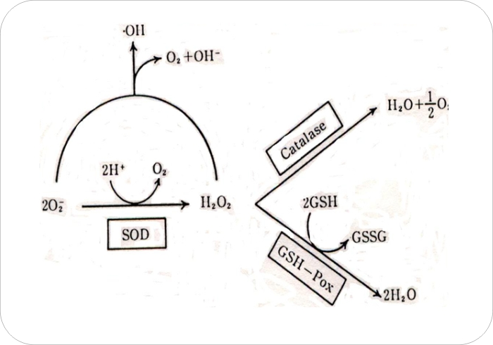 體內抗氧化防禦系統須要SOD 將 (O2·-) 歧化成 H2O2,然後藉由 Catalase 或 GSH 與 GSH-Pox 將H2O2 與過氧化脂質解毒,體內也有許多螯合與運輸鐵的蛋白質,來避免游離鐵與 H2O2 產生最毒的 (·OH )。